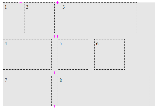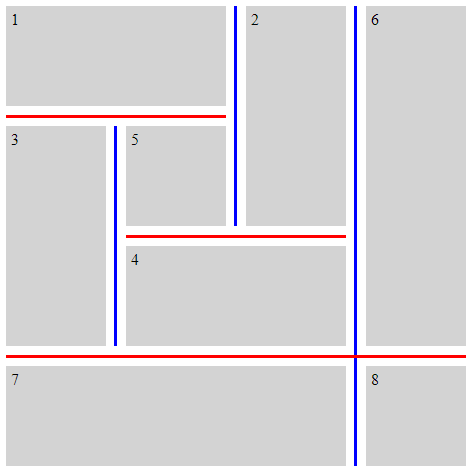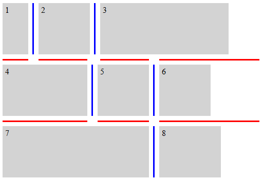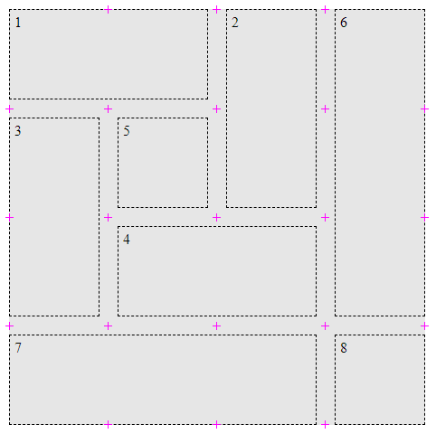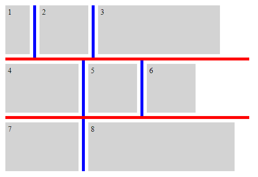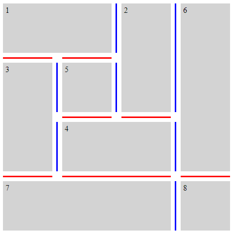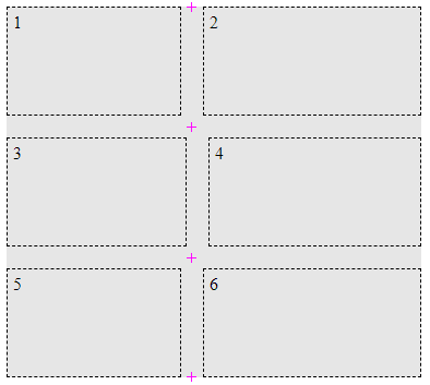 Note: CSS Box Alignment 3 § 8.1 Row and Column Gutters: the row-gap and column-gap properties defines cross-direction gaps in flex containers as being between adacent flex items in a single line. Thus, in the example above, even though the right edges of #4 and #7 line up, and the left edges of #5 and #8 line up, the spaces between those two pairs of items are two distinct gaps since they are on different lines. Therefore, the intersection between #4, #5, #7, and #8 contains two gap intersection points whose locations coincide: one at the bottom of the gap between #4 and #5, and one at the top of the gap between #7 and #8.