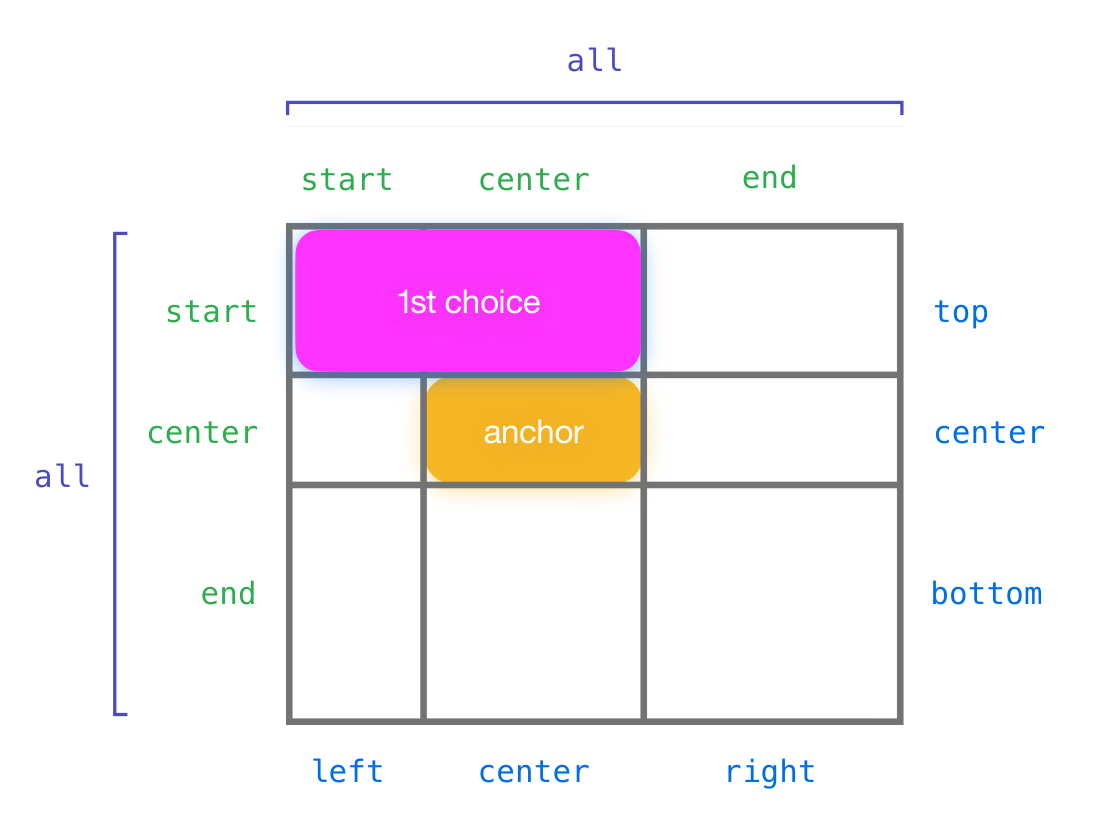 CSS absolute positioning allows authors to place boxes anywhere on the page, without regard to the layout of other boxes besides their containing block. This flexibility can be very useful, but also very limiting—often you want to position relative to some other box. Anchor positioning (via the position-anchor and position-area properties and/or the anchor functions anchor() and anchor-size()) allows authors to achieve this, “anchoring” an absolutely positioned box to one or more other boxes on the page (its anchor references, while also allowing them to try several possible positions to find the “best” one that avoids overlap/overflow.