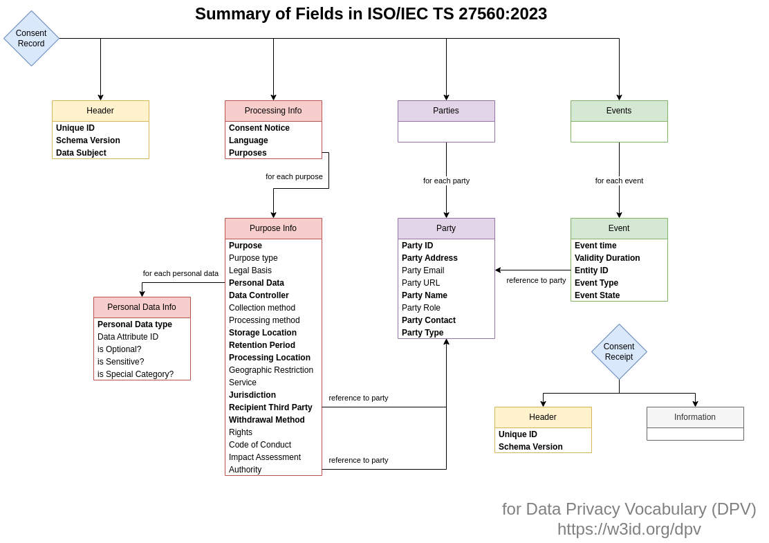 Figure 2 Summary of fields in ISO/IEC TS 27560:2023. The field names have been modified for alignment with DPV concepts. Field names in bold are mandatory.