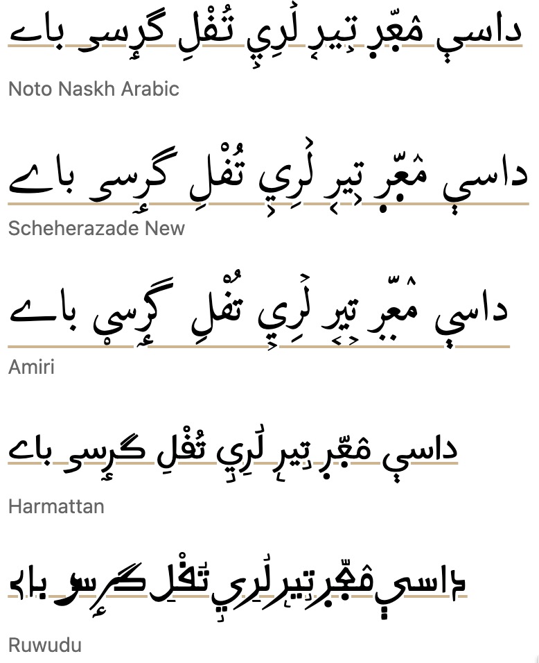 r12a: Arabic (no vowel signs) • Wolofal, Hausa, Pashto, Kashmiri (Arabic WITH vowel signs) • Javanese • Khmer • Tibetan