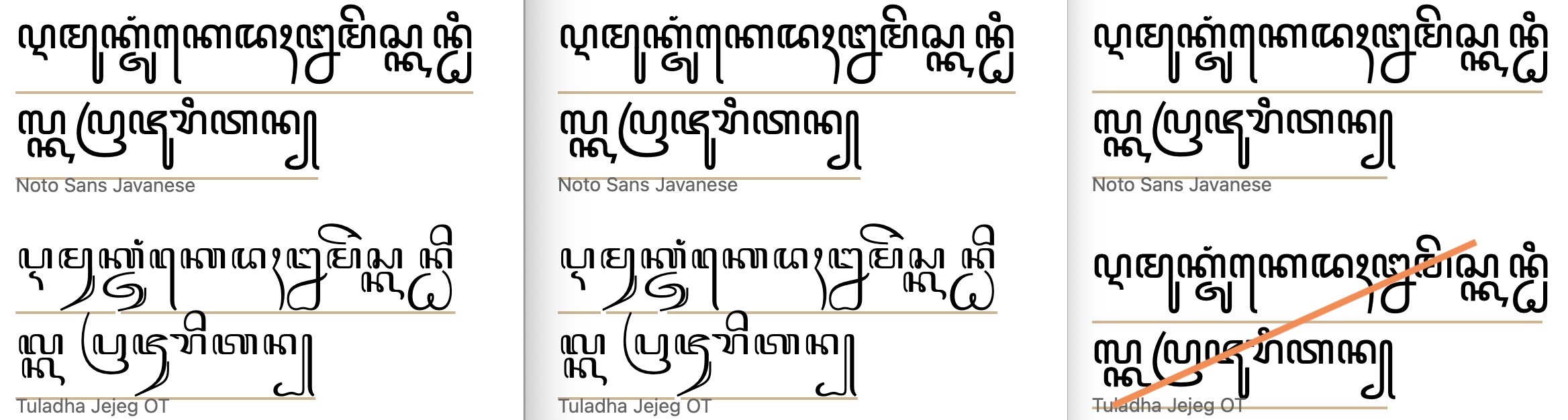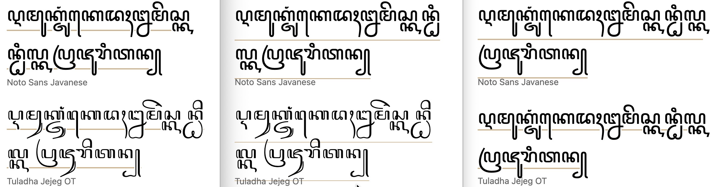 text-underline-offset value is set to 75%. (Safari results are not shown since no preinstalled fonts support the diacritics for these languages.)Javanese. A setting of 100% consistently cleared the longest descents.