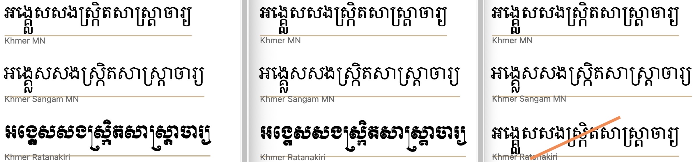under.Khmer. In the Chrome browser the underline sometimes clears single subjoined consonants, but not always. When there are two subjoined consonants (not very common), the line doesn't clear the bottom of the glyph. Firefox and Safari (only two fonts shown) both clear the bottom of all glyphs. For a typical text, this means that there is a fair-sized gap between the line and the bottom of the glyphs.