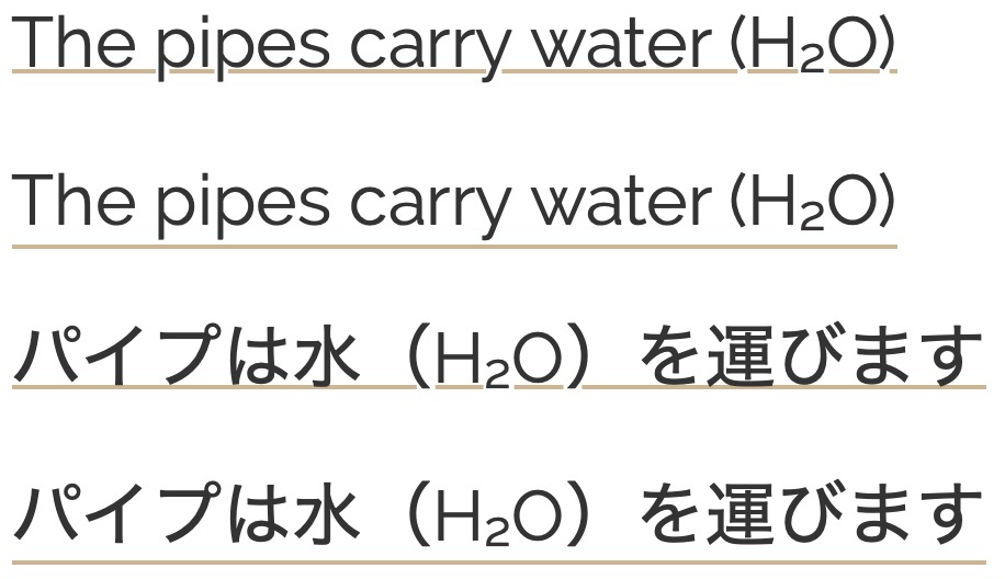 It was noticeable that whereas Chrome and Firefox placed the underline very close to the vertical text for Japanese, Safari placed it further away. The property text-underline-offset can be used to move the underline, but this also has variable effects from browser to browser.