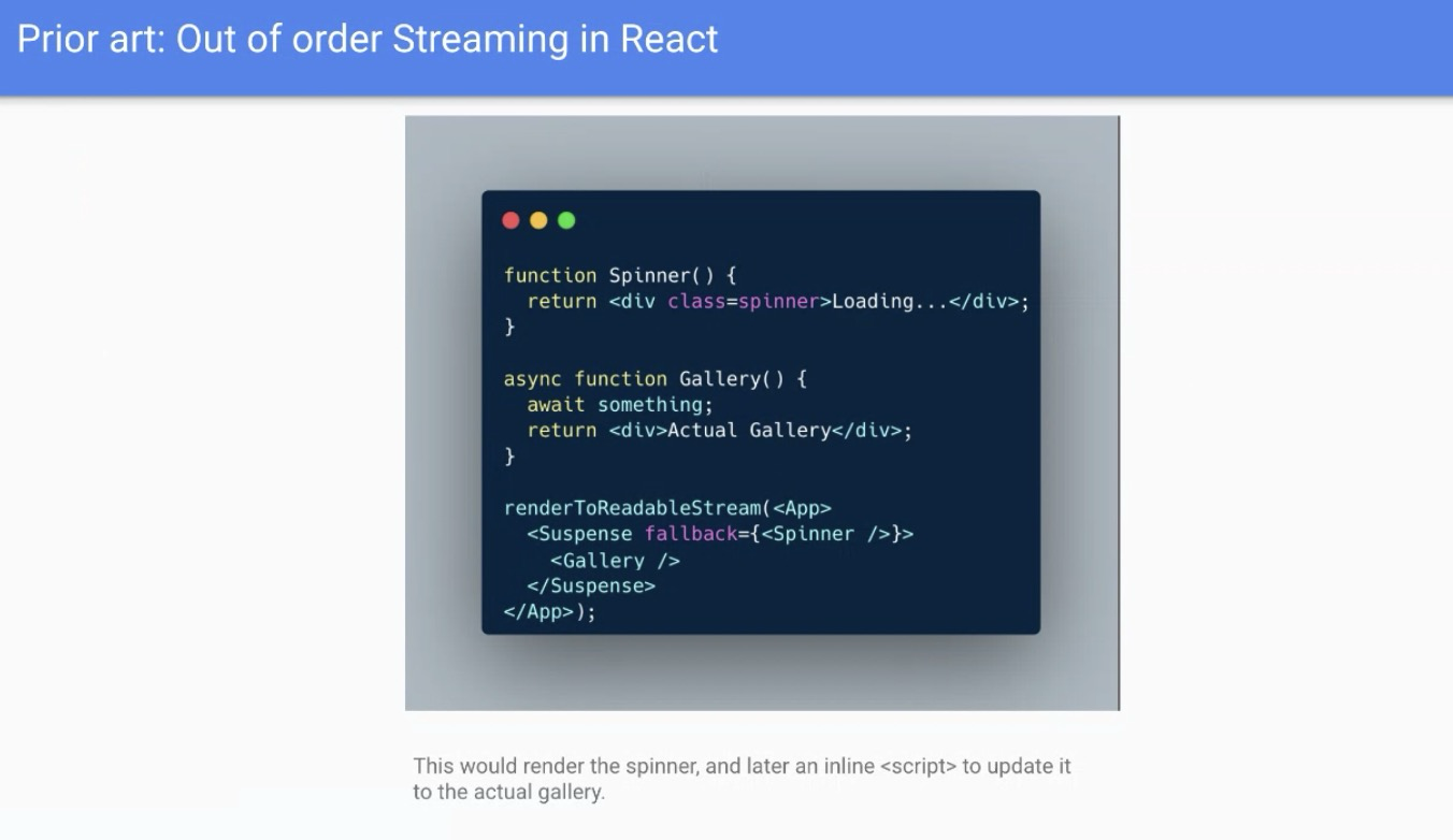 - ... Render has renderToReadableStream, can have boundaries, in this case the Spinner would be rendered into HTML