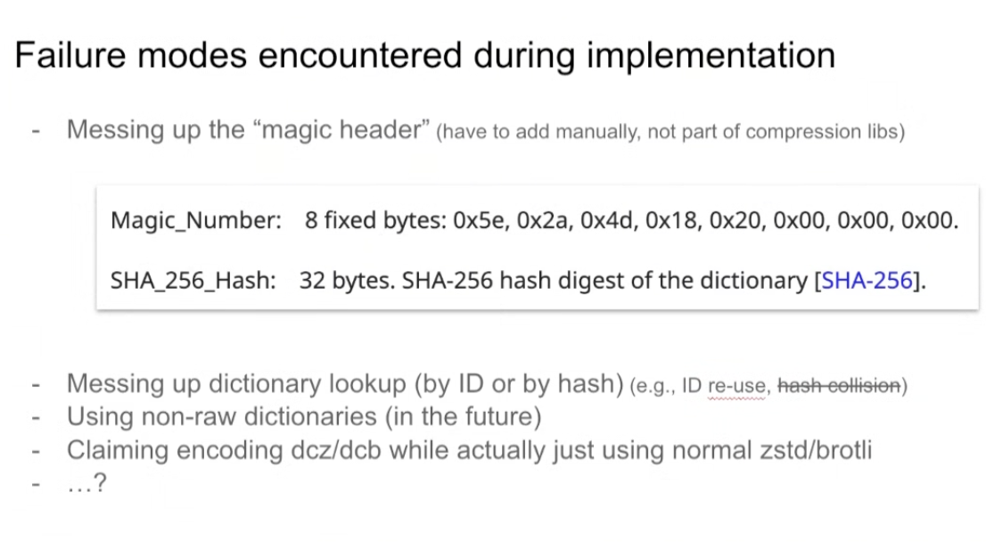 Pat: Haven;t looked at the spec, but MDN claims HTTP_RESPONSE_INVALID should cover improper encoding. So the browser should spit that out when there are invalid compression dictionaries