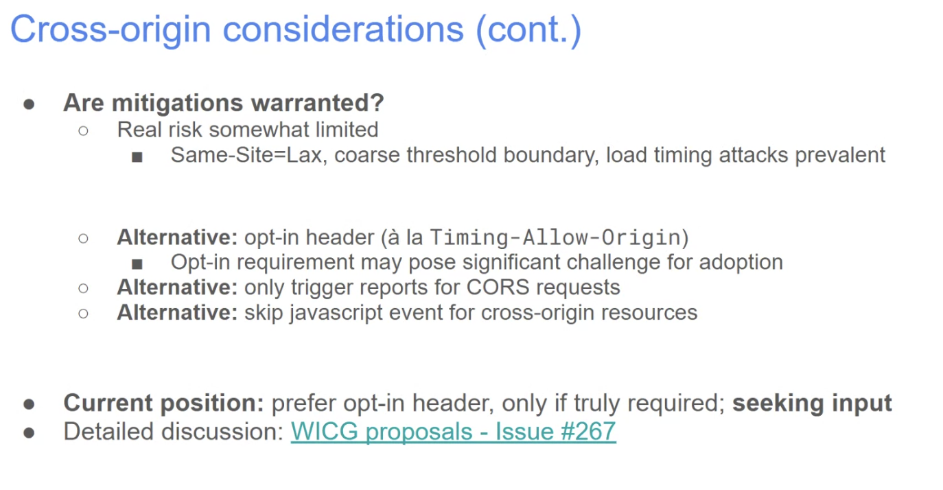 - Yoav: Cross-origin leak is a very meaningful one, not just theoretical. Not limited to just login status detection. Some insights have a lot of info about you can make an image or not based on demographic groups.